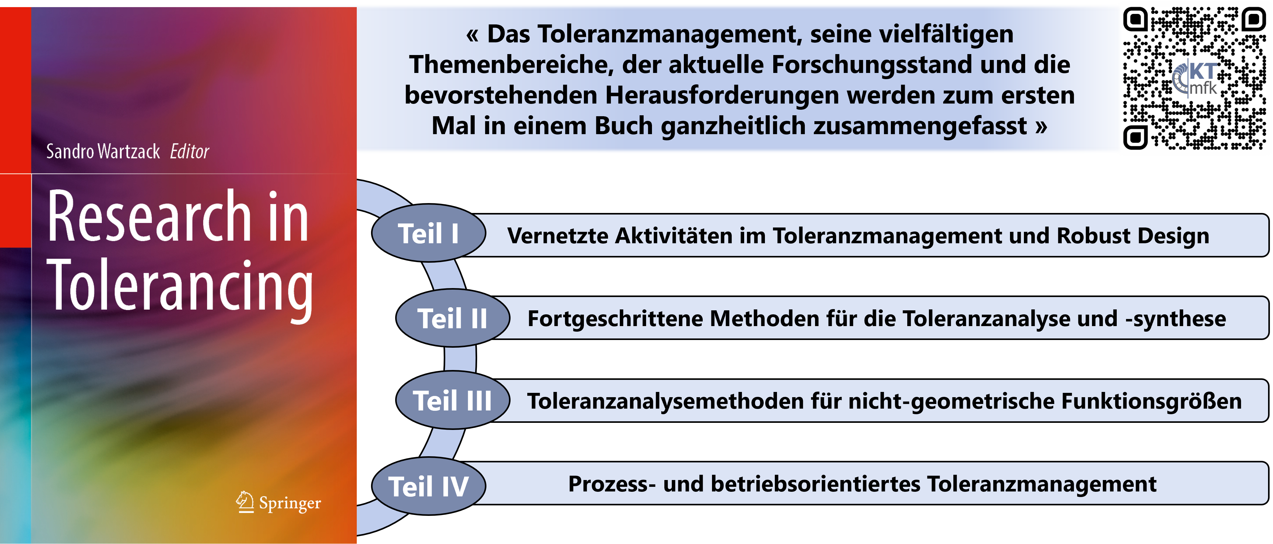 Das spannende Forschungsfeld des Toleranzmanagements begleitet den Lehrstuhl für Konstruktionstechnik bereits seit vielen Jahren, daher haben wir dies als Anlass genutzt, den aktuellen Erkenntnisstand in einem Buch zusammenzuführen. Unter dem Titel „Research in Tolerancing“ vereint dieses Buch die Ergebnisse aus den vielfältigen Forschungsthemen unserer ehemaligen sowie aktuellen Mitarbeitenden des Lehrstuhls. Im Rahmen von vier Teilen und insgesamt elf Kapiteln fasst das Buch die vielfältigen Facetten des Toleranzmanagements zusammen, bietet dabei wertvolle Einblicke sowie praxisnahe Methoden und deckt darüber hinaus auch zukünftige Herausforderungen in diesem Feld auf. Das Buch ist im Springer-Verlag veröffentlicht und bereits digital sowie im Print erhältlich!